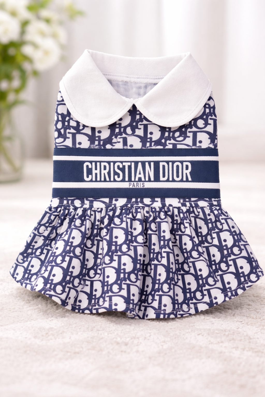 Zarif ve şık tasarımıyla öne çıkan bu özel köpek elbisesi, Christian Dior estetiğini minik dostlarınızla buluşturuyor. Lacivert-beyaz monogram deseni, markanın ikonik stilini yansıtırken, klasik beyaz yakası elbiseye sofistike bir dokunuş katıyor. Yumuşak ve kaliteli kumaşı sayesinde köpeğinizin konforunu ön planda tutarken, hafif ve nefes alabilen yapısıyla gün boyu rahat kullanım sağlar. Bel kısmındaki logo detayı ve pileli etek formu, ürünü hem günlük kullanım hem de özel çekimler için ideal hale getirir. Şıklık ve konforu bir araya getiren bu tasarım, küçük ırk köpekler için mükemmel bir stil tamamlayıcıdır.